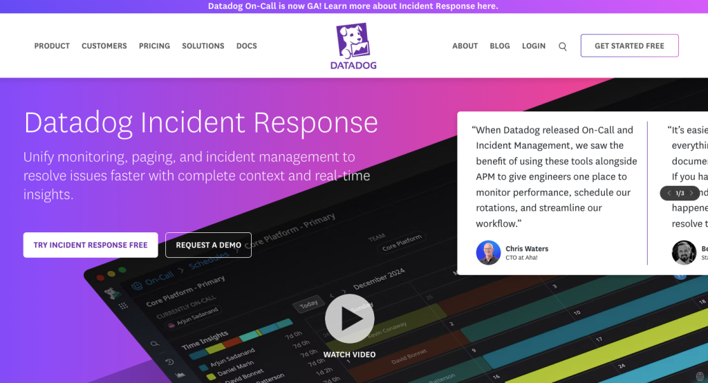 Datadog Oncall integrates incident response with Datadog’s robust observability platform, embedding monitoring data directly into your incident management workflow.
