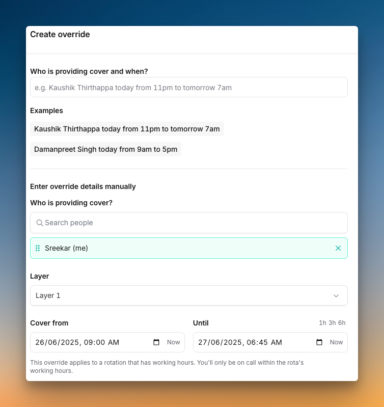 Incident.io lets you create overrides with a simple button or by clicking on the calendar. You can even type an override in plain language, like “Kaushik Thirthappa today from 11 pm to tomorrow 7 am.”