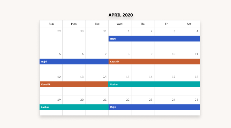 The calendar view in Spike enables all team members to view the ongoing and upcoming on-call schedules. It is displayed inside schedule details.