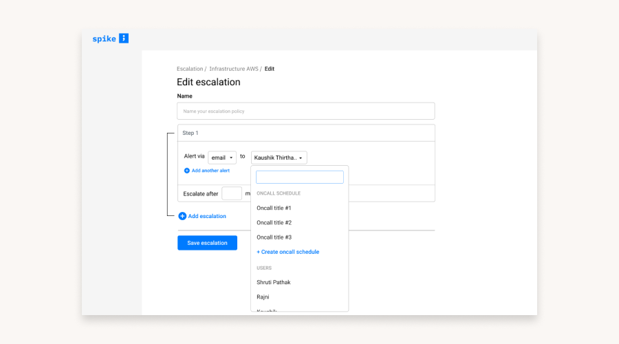 After an on-call schedule is created, users can then add a specific schedule to an escalation policy. Select the On-call schedule name from the users dropdown present in the escalation steps while creating an escalation policy.