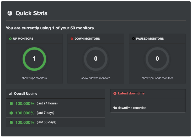 Once you create the monitor, you will start seeing the uptime stats on the UptimeRobot dashboard. You can use the TV mode feature to show all stats in a clean dashboard that can be shown prominently in your team area. You can also export the logs to perform further analysis or add to other reporting tools.