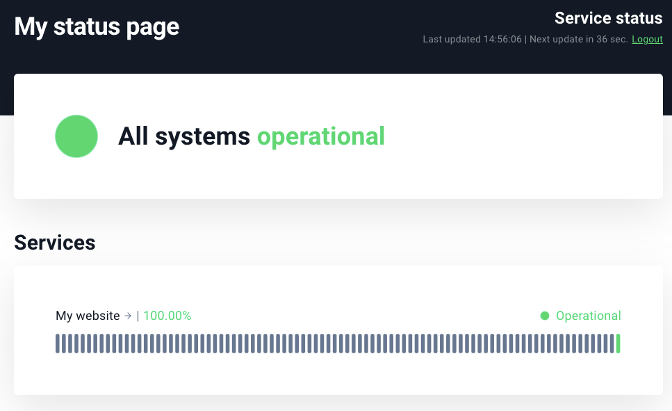 To communicate the availability of your websites and APIs to your customers, you can add a public status page using UptimeRobot. You can create a status page, add your monitors and customise the look by adding your logo and choosing a theme.