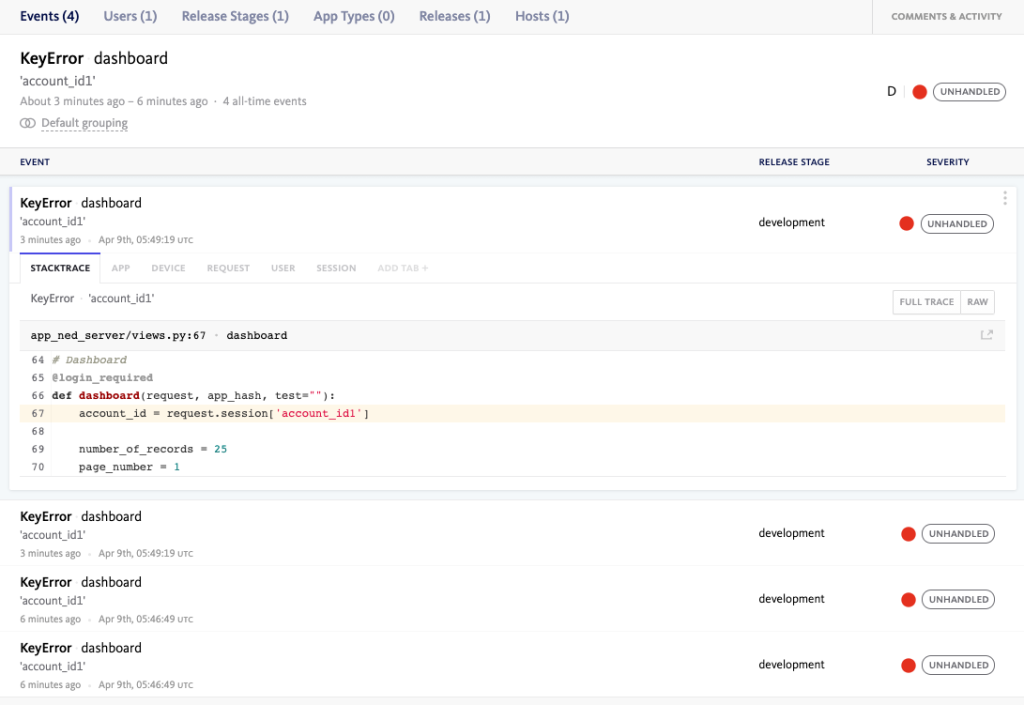 After adding the Bugsnag SDK to your code, it will start capturing unhandled exceptions and sending them to your Bugsnag project. This is how an error will look like in Bugsnag.