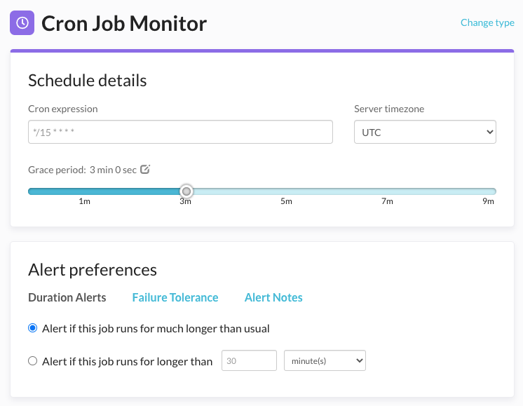 Next, you should specify if you want to be alerted if your cron job runs for longer than usual. You can specify the maximum time for which Cronitor can wait for job completion before it sends an alert. This is useful when slow performing cron jobs can cause issues.