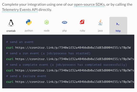 After creating a new monitor, you should integrate Cronitor in your cron job. Cronitor has SDKs for different languages like Python, node.js etc. You can also call the unique HTTP URLs in your cron job to tell Cronitor when your cron job starts, completes and fails.