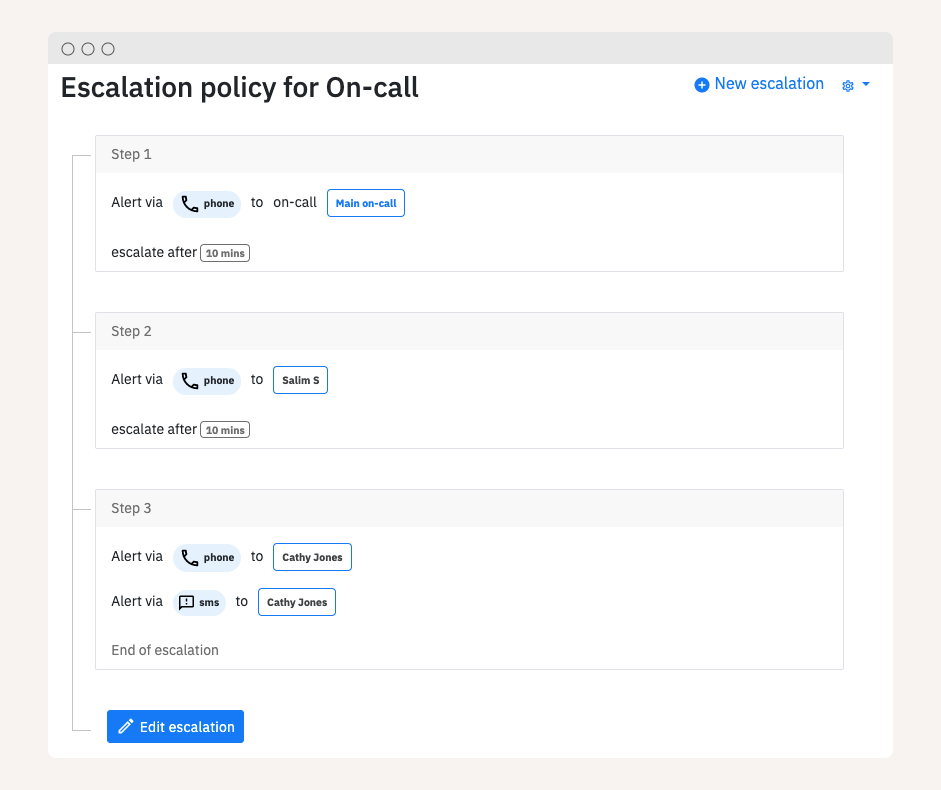 For example, consider that you have a service with 99.99% SLA, which only allows for about 52 minutes of downtime per year. The escalation policy for that service will be very tight, requiring a team member to respond to the alert within 5 minutes before escalating the issue. If a service does not have a strict SLA or is not a critical service, it is better to keep response time longer e.g. 30 minutes, which can give the team member time to finish her current task.