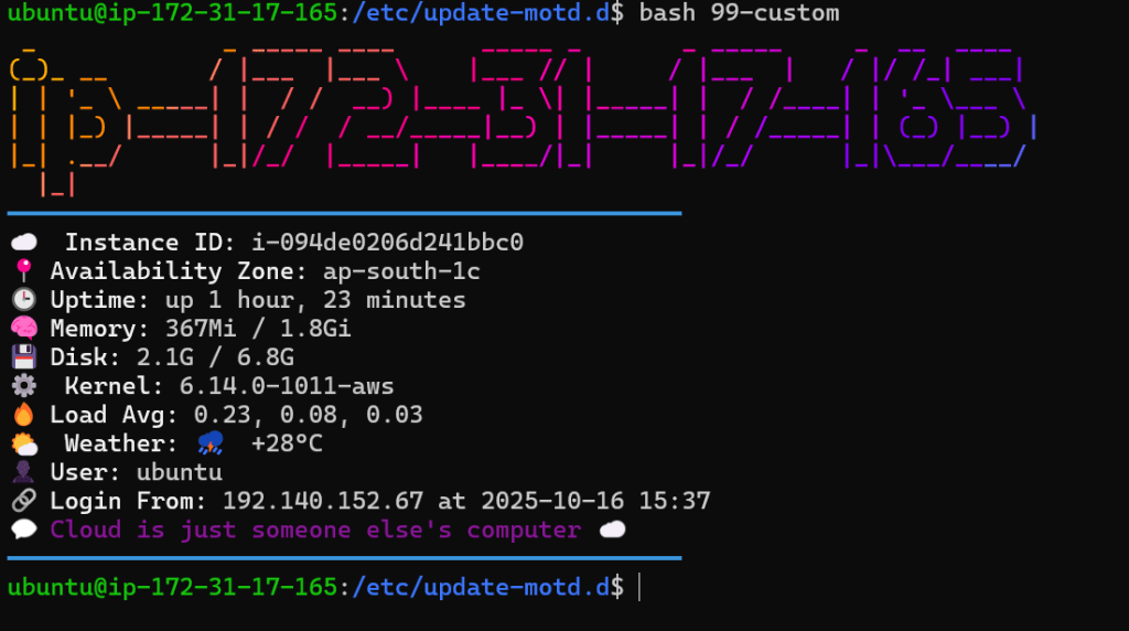 Today, in the age of cloud, MOTD has found a new role. It’s no longer just for messages, it’s a tiny dashboard, capable of showing system health, instance metadata, or even deployment info. Ubuntu, for example, takes it further with dynamic MOTDs that change every time you log in, generated by small scripts under /etc/update-motd.d/