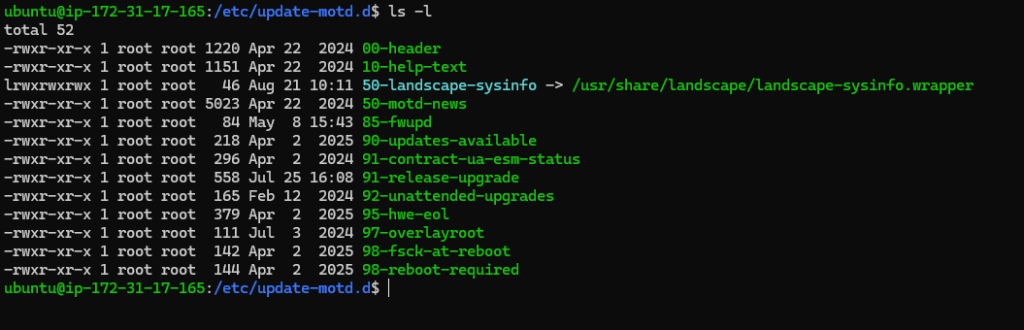 - 50-landscape-sysinfo → Shows system info (CPU, load, memory)