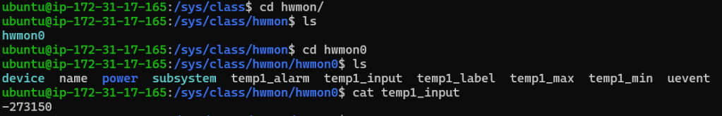On a cloud VM, there’s no access to physical hardware sensors, so system files like /sys/class/hwmon/ just return placeholder values. That’s why temperatures like -273.1°C appear it’s the kernel’s way of saying the data isn’t available.