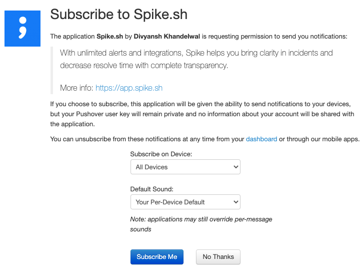 - You will be taken to the Pushover website. Log in to your account and on the “Subscribe to Spike.sh” page, click on Subscribe Me. You should receive a confirmation notification from Pushover.