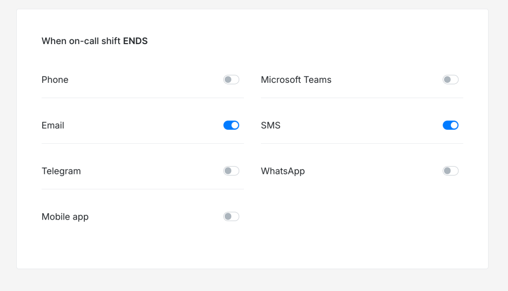 You’ll probably want to get notified when your on-call shift starts and ends, so you’re never caught off guard. Tools like Spike let you configure these notifications on your preferred channels—phone call, SMS, email, WhatsApp, Telegram, Microsoft Teams, or the mobile app.